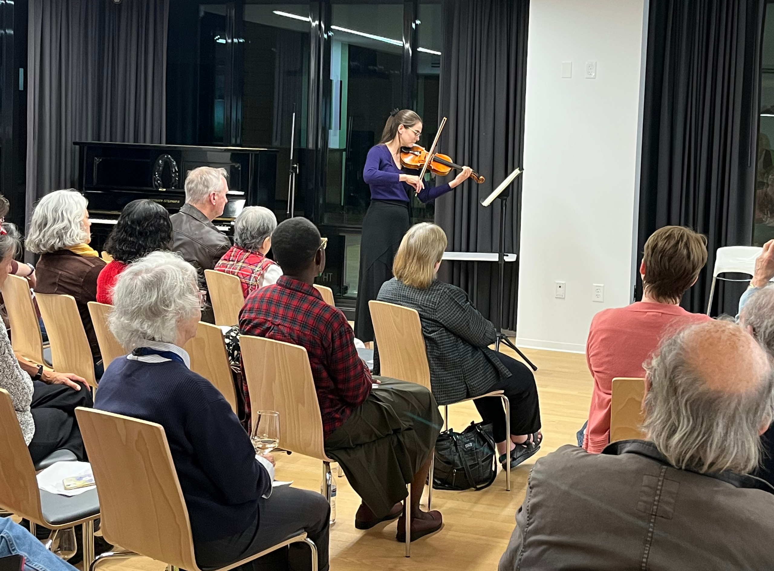 For our inaugural entry into The Big Idea series, PEN/Faulkner partnered with Goethe-Institut Washington to present novelist Martha Anne Toll, author of Duet for One, in dialogue with interdisciplinary artist Leigh Davis, the creator of Karaoke in the Cemetery. The conversation was moderated by Ann Meier Baker, former director of music and opera for the NEA, included a short performance by violinist Robin Tozzie and a small pre-event wine reception.
